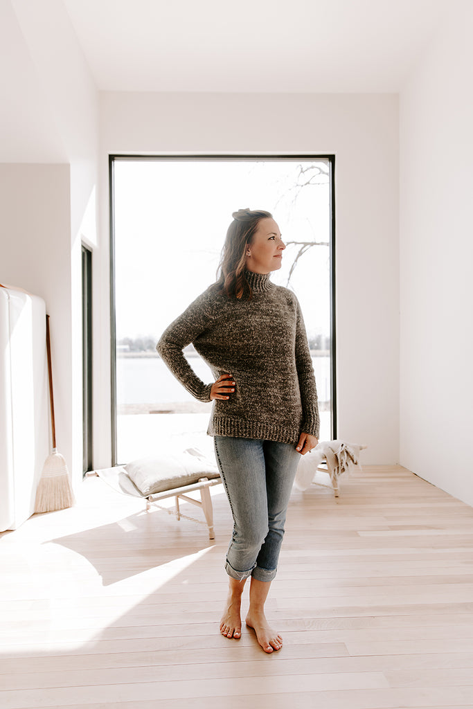 Inspired by a favorite sweatshirt that I’ve had in my closet for over a decade, the silhouette of this sweater has an oversized body, dolman sleeves, and long narrow cuffs. These design features, combined with a mock turtleneck and hi-low hem result in a flattering and comfy wardrobe staple everyone needs. I know I’ll keep this cozy sweater in my rotation for years to come! Plus, the marled fabric created by holding The Farmer’s Daughter bases Recollect and Oh Dang is stunning. Even better, the fabric these two yarns create feel AMAZING when next to your skin!